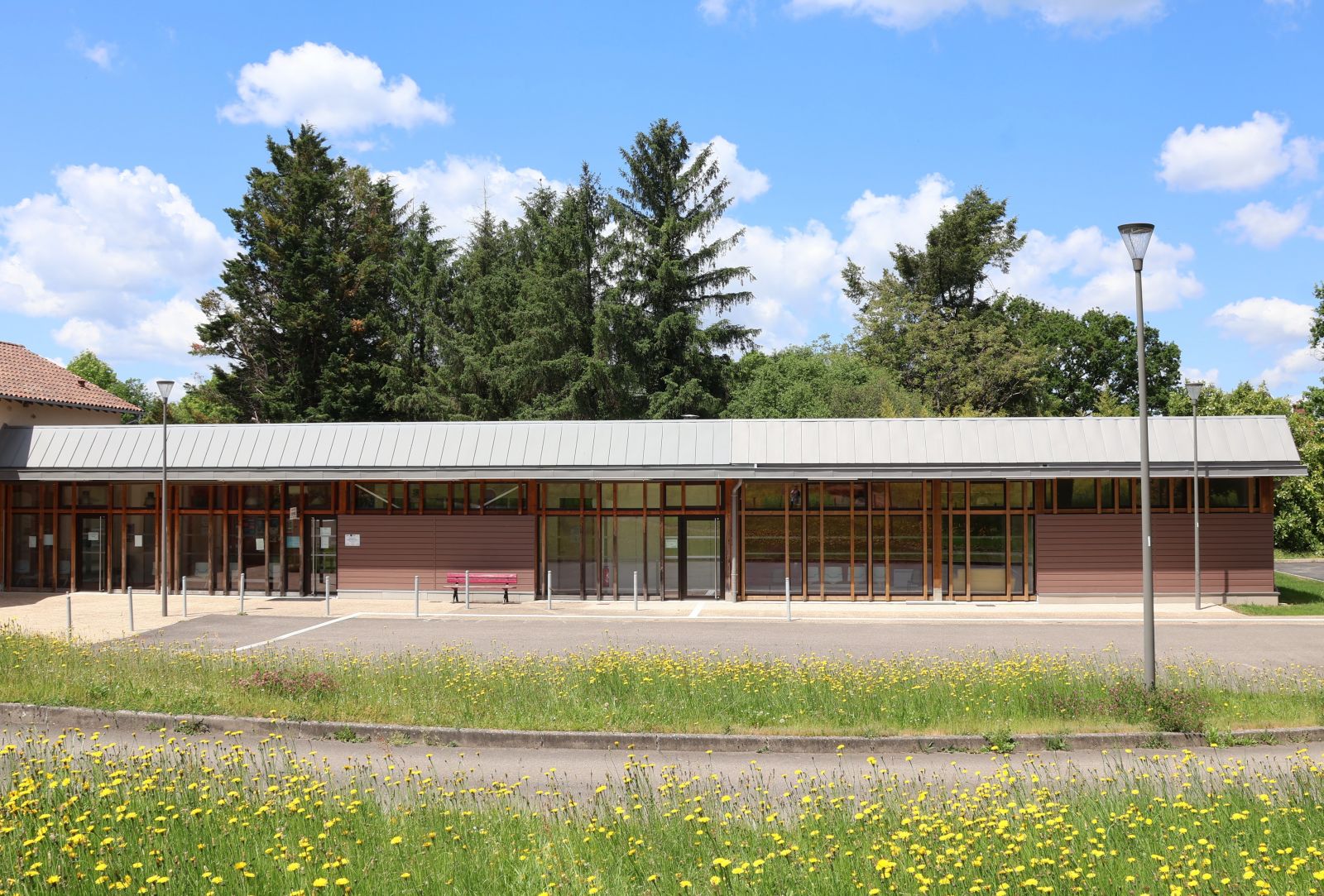 L'enseignement se fait dans un espace modulable, avec possibilité d'ouverture sous le préau. Ce dernier est transformé en une coursive longeant la cour, belvédère sur le paysage mais aussi protection solaire des salles généreusement vitrées. L'aménagement de la cour fait partie intégrante du projet : un espace ludique conjugué au redimensionnement de la prairie crée de nouvelles situations de jeux et facilite la surveillance.