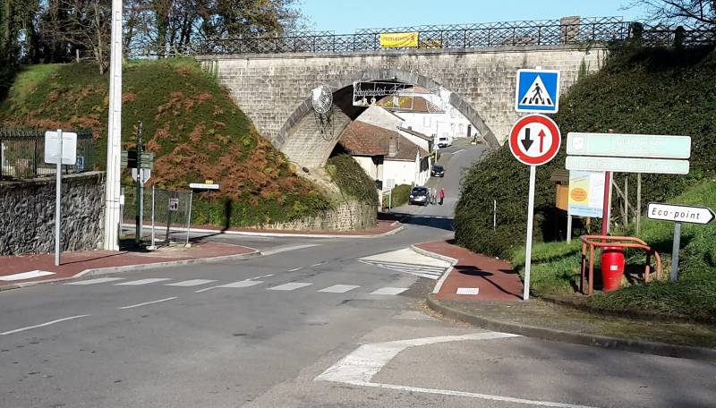 Après la suppression des feux de circulation, ce croisement des routes départementales RD 6bis et RD 42 est désormais équipé d’une « écluse » en zone 30 qui instaure un alternat entre les 2 sens de circulation sous le pont qui enjambe la RD 6bis ; la suppression d’une voie de circulation permet ainsi la création d’un cheminement piéton (trottoirs et passages piétons).