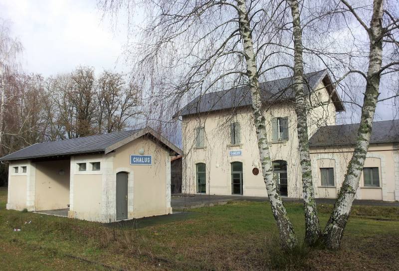 L'ancienne gare de Châlus, inaugurée le 13 novembre 1881, était l'une des plus importantes de la région à son époque. Fermée en 1987, elle a été rachetée par la commune de Châlus qui a réalisé sa réhabilitation (ainsi que celle de la lampisterie, avec l’aide du Syndicat de la Voie Verte-SIVU), de l’Etat, de la Région et du Conseil Général.
