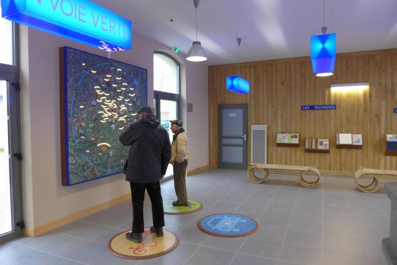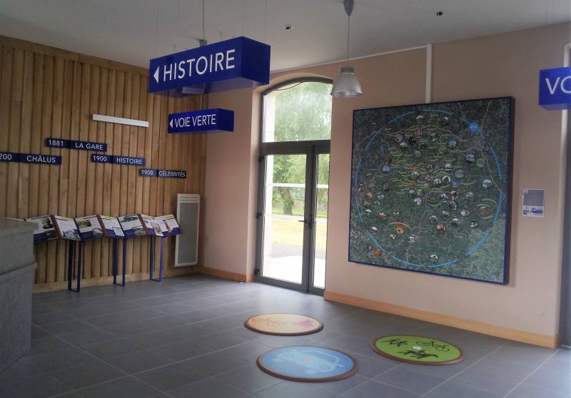Dans l’ancienne salle d’attente, une scénographie retrace l’histoire de la gare et celle de Châlus et présente les richesses et les personnalités du territoire. Une carte lumineuse propose de visualiser des possibilités de parcours, pour découvrir les alentours jusqu’à 50 km, selon son moyen de locomotion : à pied, à cheval, en vélo ou en voiture.