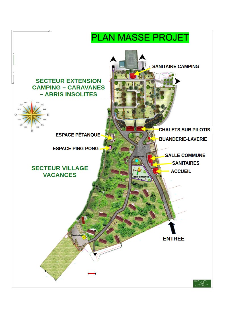 A partir de l’avant-projet, le maître d’œuvre - ATEL/ Paysage Ingénierie International (ATEL/PII) de Limoges - a élaboré le projet définitif qui fait apparaître un agrandissement du site sur l’actuel ‘stade gris’ pour la création d’un espace camping/caravaning et habitat type ‘cabane’ ainsi que d’un espace sanitaire.